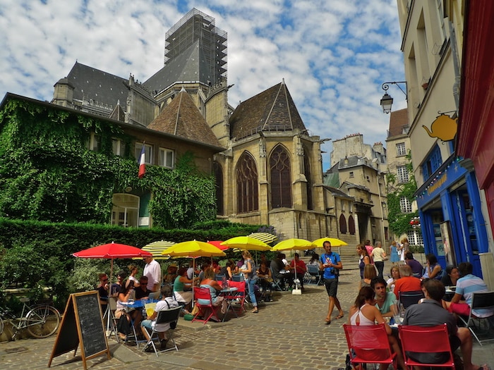 Derrière l’église Saint-Gervais, l’atmosphère de village subsiste à quelques pas de l’Hôtel de Ville.
