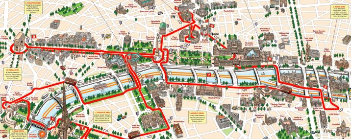Le lendemain, passage obligé par le bus touristique. Billets récupérés à deux pas du Louvre (repérez l’icône œil sur la carte), on rejoint l’arrêt numéro 4, juste en face du musée :